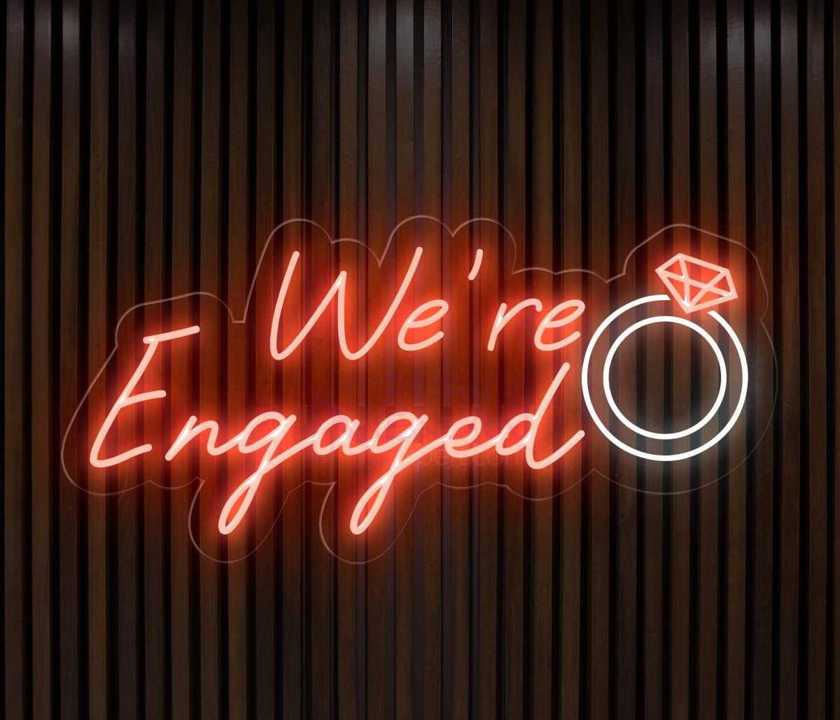 DESIGN FEATURES : Eye-catching orange neon LED text displaying 'We're engaged' in elegant cursive script