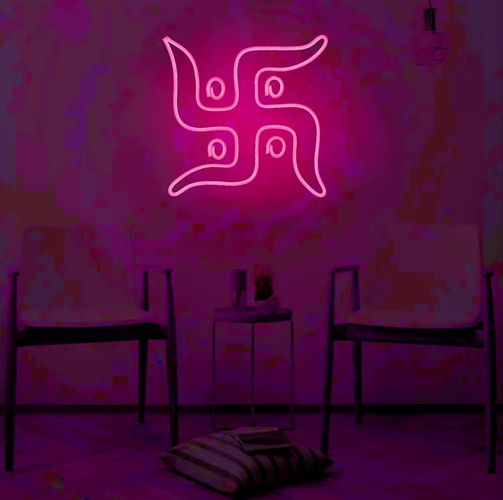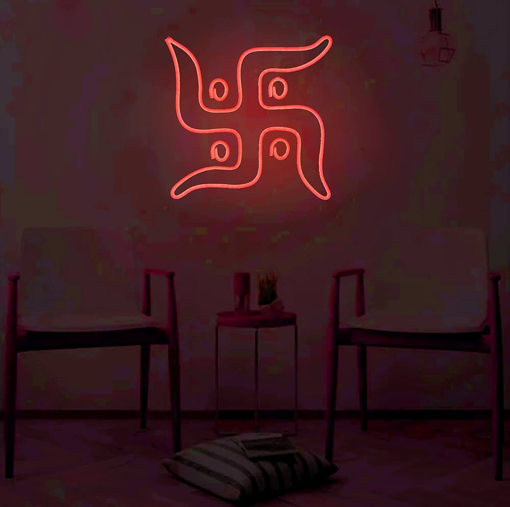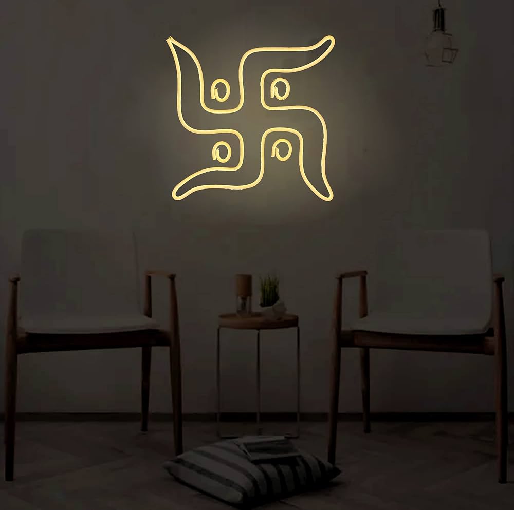 DESIGN FEATURES : Eye-catching orange neon LED text displaying 'Swastik' in elegant cursive script